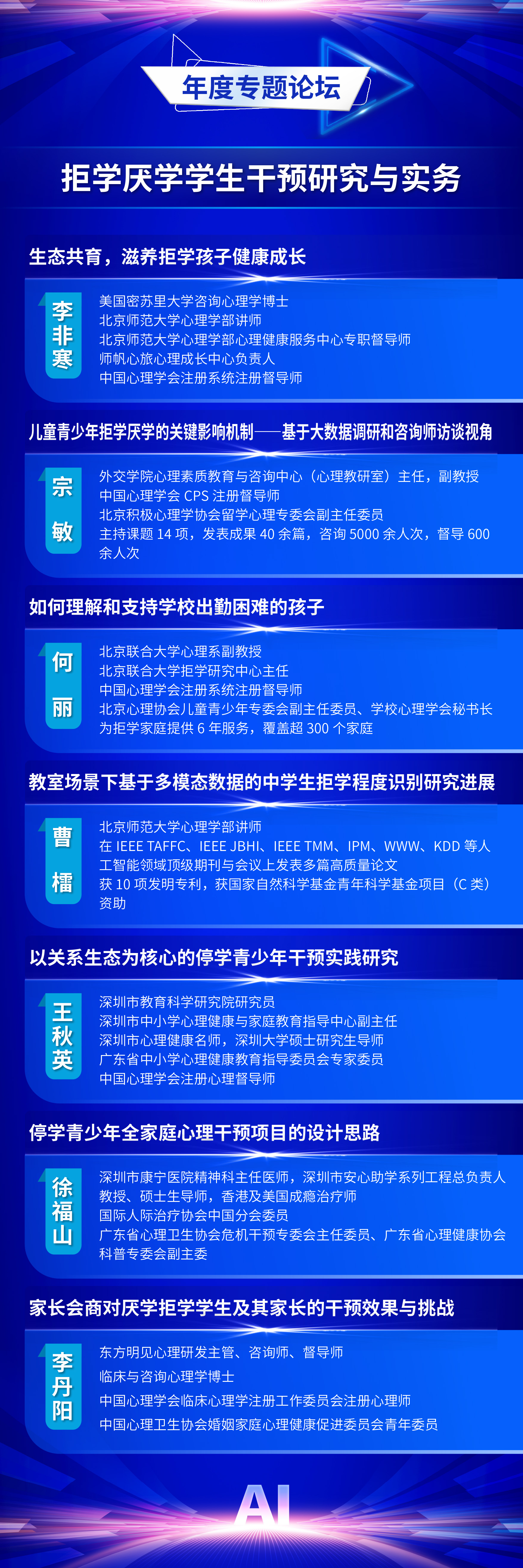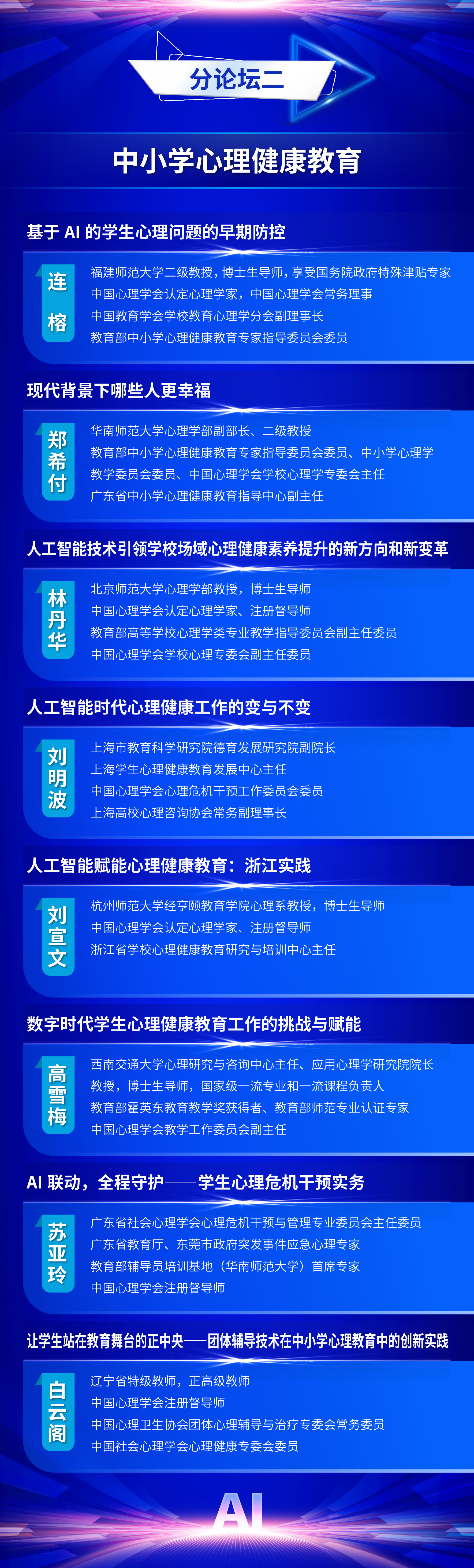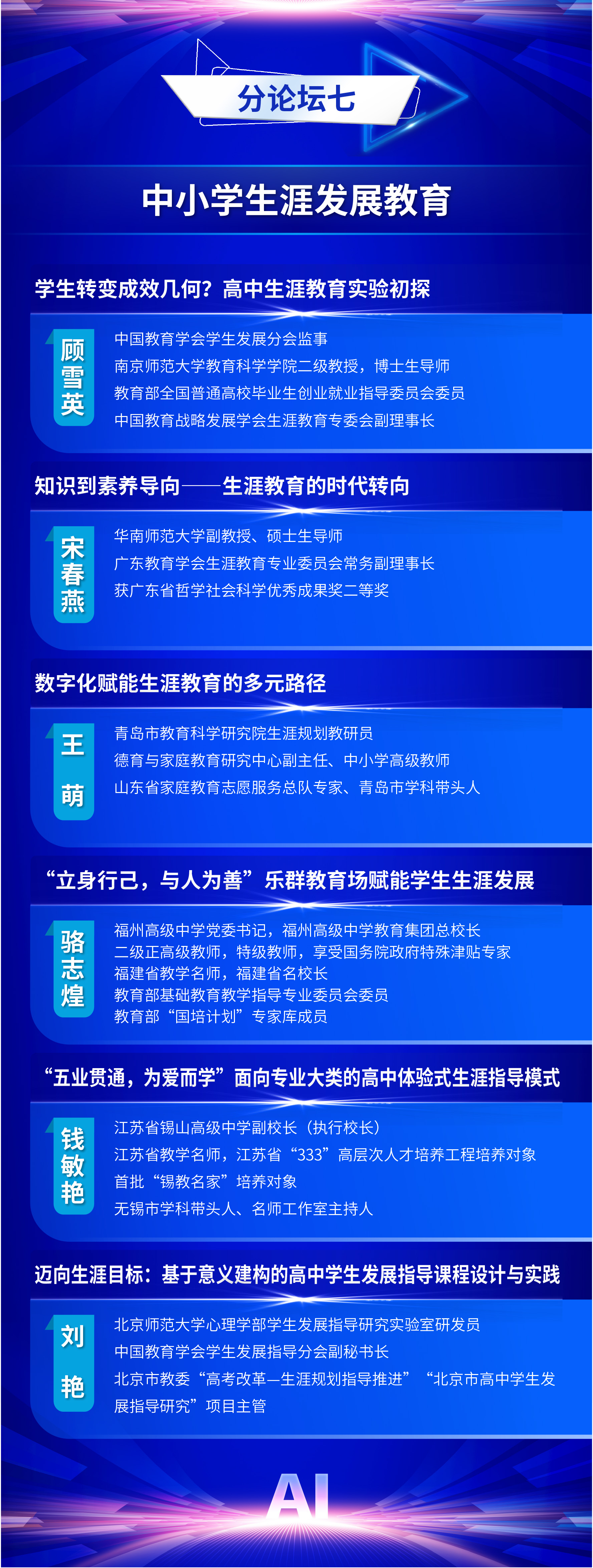 为全面贯彻党的二十届三中全会精神和全国教育大会精神,认真落实《教育强国建设规划纲要(2024-2035年)》,推动数智时代学生发展指导工作的创新与实践,中国教育学会学生发展指导分会定于2025年11月7日—11月8日在福建福耀科技大学(福州市)举办中国教育学会学生发展指导分会2025学术年会。现将有关事项通知如下: 一、会议主题 人工智能赋能学生发展指导 二、组织单位 主办单位:中国教育学会学生发展指导分会 北京师范大学心理学部 承办单位:北京师范大学出版集团 支持单位:福州市教育局 福建福耀科技大学 福建师范大学心理学院 三、时间地点 会议时间:2025年11月7日—11月8日 会议地点:福耀科技大学国际学术交流中心(福州佩伯酒店) 四、会议日程 11月6日全天 报到 11月7日上午 开幕式,主旨报告 11月7日下午 校长论坛:迈向数智时代的教育新生态 分论坛一:拔尖创新人才培养 分论坛二:中小学心理健康教育 分论坛三:人工智能背景下的劳动与实践育人 分论坛四:校家社医协同育人 平行分会场论文报告 11月8日上午 分论坛五:学生发展指导中的AI应用 分论坛六:AI背景下“以学为中心”教学方式改革 分论坛七:中小学生涯发展教育 年度专题论坛:拒学厌学学生干预研究与实务 平行分会场论文报告 11月8日下午 主旨报告,闭幕式 五、出席嘉宾