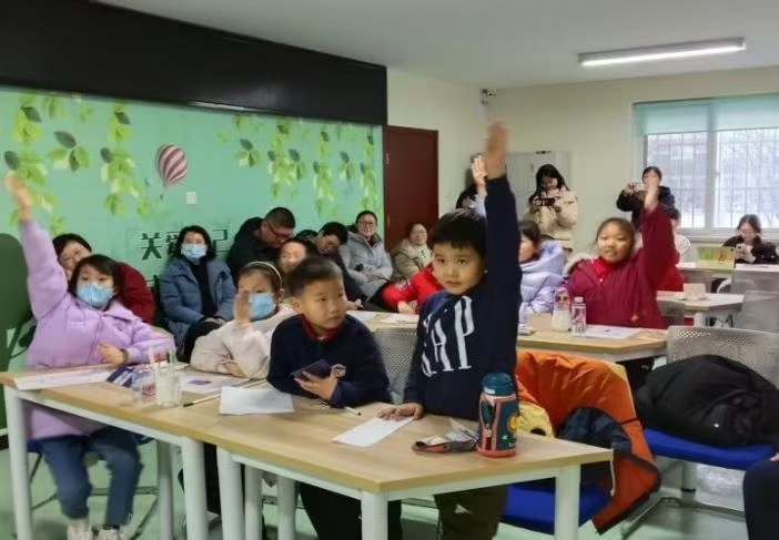 图5 小朋友们在积极举手展示 最后,邵小雅进行了活动总结,表示“学会与情绪共处,是送给自己的最好礼物”。支部成员给每个小朋友发放了文具奖品,并收集了家长们的反馈和建议。