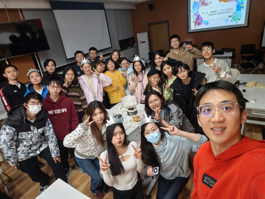 隆重的祝福仪式过后,各小组内开启了派对模式。大家共享蛋糕,一起玩“数字炸弹”“真心话大冒险”小游戏,简单而刺激,紧张又有趣,蛋糕的甜美与游戏的欢乐让同学们抛却了一周的烦恼,卸下了平日的粉装,尽情地、真实地投入到了与团体共度的时间里,就像那句话所说:“只要在一起就很开心!” 快乐的时光总是短暂,一个小时的生日会很快接近尾声。相机的快门“咔嚓”一响,今晚的留念就此定格。生日会是一场真心对真心的派对,是纯粹与纯粹的相会。希望我们都能珍惜这份美好的情谊!