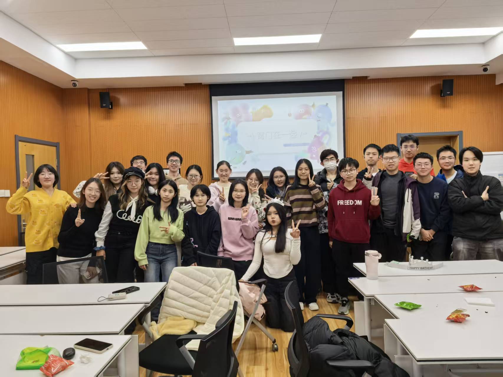 2025年12月9日晚18:00,心理学部2025级综合&励耘班为生日在9-12月的小寿星们举办了生日会。活动由生活委员缪蕴美、柴一诺策划并主持,两班同学均有到场,班主任齐老师惊喜参会。 活动伊始,二位主持人为前来祝寿的同学们分发了印有零散故事片段的小纸条作为分组的依据,能够拼出一则完整故事的字条被分到同一个小组。有趣的小故事让现场充满了快活的空气。 接着,大屏上依次呈现出各位小寿星们的个性特征,随着“星动嘉宾”的神秘身份被一一揭晓,各个小组也迎来了它们的小组长。轻松的互动环节增进了同学们的彼此了解,同时让生日会的氛围更加愉快。 热场环节过后,便是万众期待的分蛋糕环节!全场熄灯,烛光曳曳,《生日歌》的旋律轻轻响起;一齐拍手,一同唱歌,友谊的涟漪悠悠泛起。小寿星许下心愿,种下祝福;同学们目光炯炯,暖意浓浓。综合励耘在此时此刻变成了一个拥抱着所有人的大家庭。