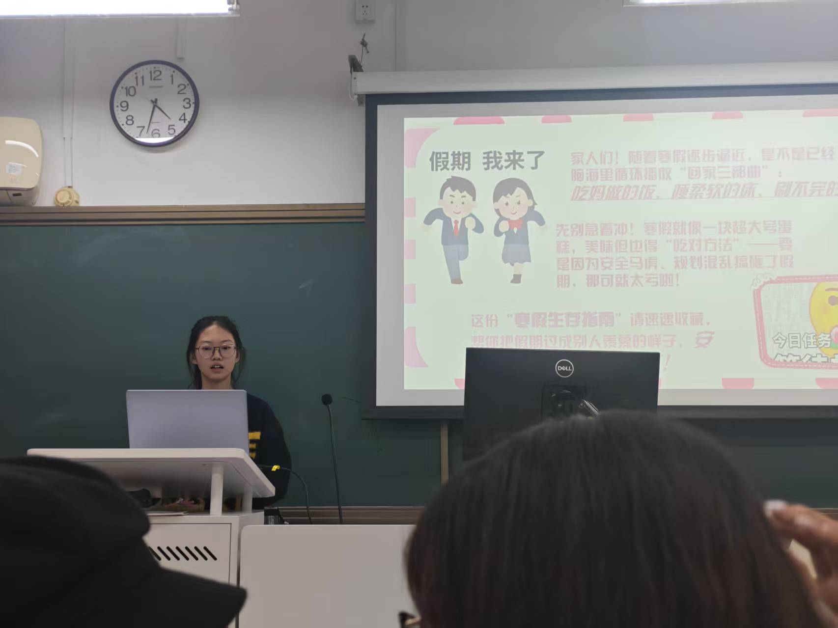 合唱结束后,团支书杨紫盈围绕假期安全与自我提升两大核心板块展开详细分享。在假期时间梳理环节,她明确了寒假起止节点及重要时间节点提醒,帮助团员们合理规划假期日程;离校注意事项方面,重点强调了宿舍安全隐患排查、个人贵重物品保管、离校报备流程等关键内容,引导大家有序离校;寒假安全教育环节,针对交通安全、消防安全、网络安全、食品安全及防范电信诈骗等重点领域,结合典型案例进行细致讲解,切实提升团员们的风险防范意识和应急处置能力;寒假自我提升部分,鼓励团员们合理安排学习、实践与休息时间,通过阅读、技能学习、志愿服务等多种形式充实自我,实现假期 “充电”;最后,她还就安全返校要求、健康监测等事宜进行说明,确保假期首尾环节安全有序。