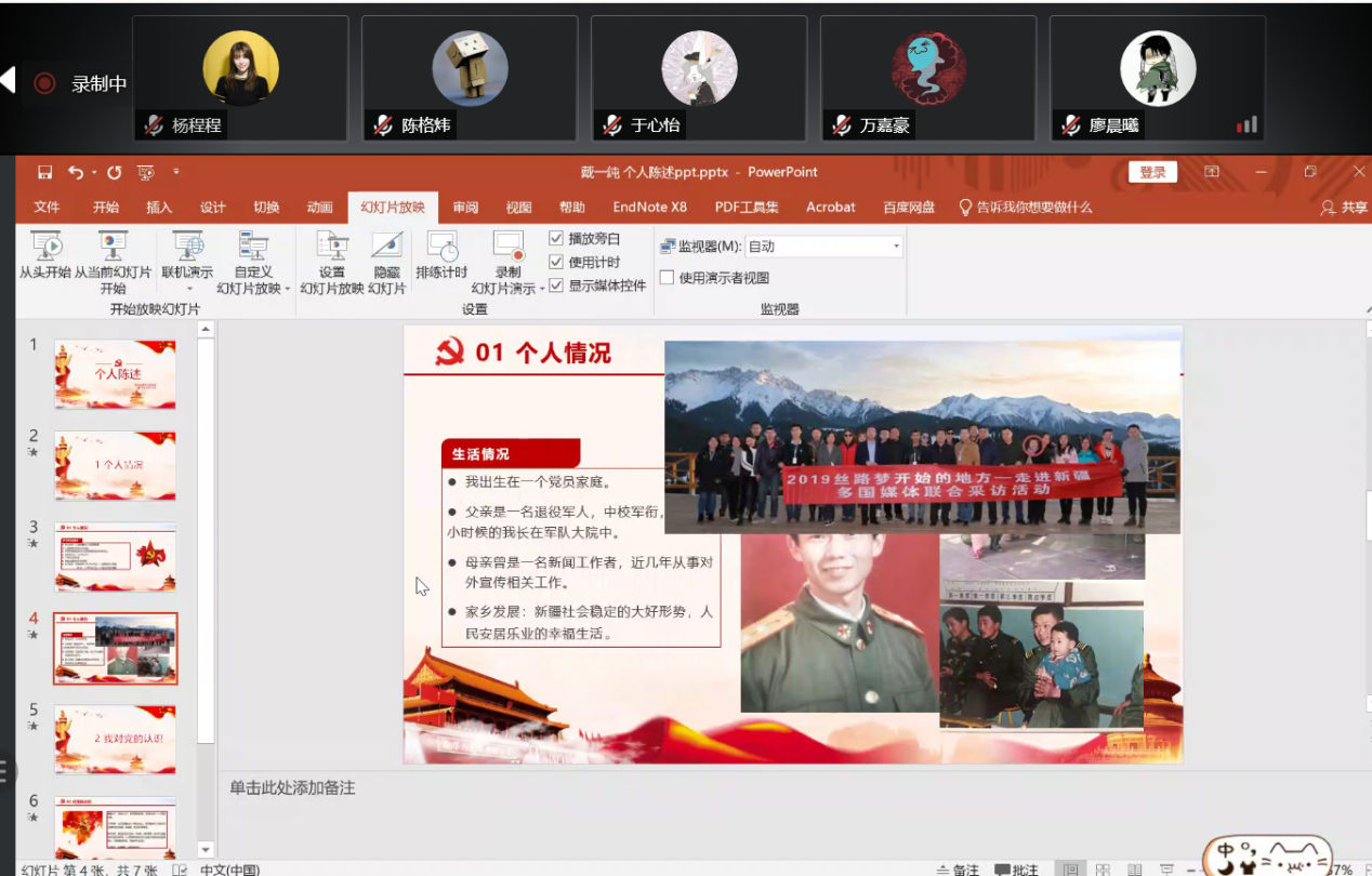 2021年3月5日上午9时,心理学部党委于线上召开了本学期的确定发展对象大会。心理学部党委副书记王瑞敏老师,心理学部团委书记、党务秘书曹昌健老师,学生党支部理论导师史佳鑫老师、周以铭老师,班主任代表刘佳辉老师出席了大会并担任评委。参加此次大会的还有部分学生党支部的支委、入党积极分子。 首先,会议主持人介绍了参会老师和会议流程。随后,15位候选人在现场进行了个人陈述。各位积极分子介绍了自己在思想、政治、学习和生活等方面的情况,陈述了各自的入党动机,分享了在向党组织靠拢过程中的思想认识与实践活动,针对评委提出的问题做出了回答。 通过老师们的提问,积极分子们对自身不足也有了进一步的认识,对入党有了更深刻的思考。 最后,王瑞敏老师做了总结发言。首先,王老师通过讲述“在新冠疫情期间,广大党员挺身而出、冲锋在前,不畏艰难险阻,奋战在疫情防控第一线”的例子,鼓励大家要在日常行动中要主动担当、积极作为。其次,王老师号召大家自觉学习“上下同心、尽锐出战、精准务实、开拓创新、攻坚克难、不负人民”的脱贫攻坚精神。王老师提到,1800多名同志将生命定格在了脱贫攻坚征程上,诸如黄文秀等基层工作者,他们用实际行动诠释了脱贫攻坚精神。再次,王老师以“中国德州寒洲与美国寒潮”进行对比,强调灾难面前我国的处理原则是人民至上,首先保证民众的基本生活所需才是头等大事,体现了中国共产党全心全意为人民服务的宗旨,鼓励大家坚定“四个自信”。最后,王老师鼓励大家认真完成学业;积极为他人、集体做出贡献;积极相应党的号召;不断的提升理论学习。 供图:研究生第7党支部 供稿:研究生第7党支部 |