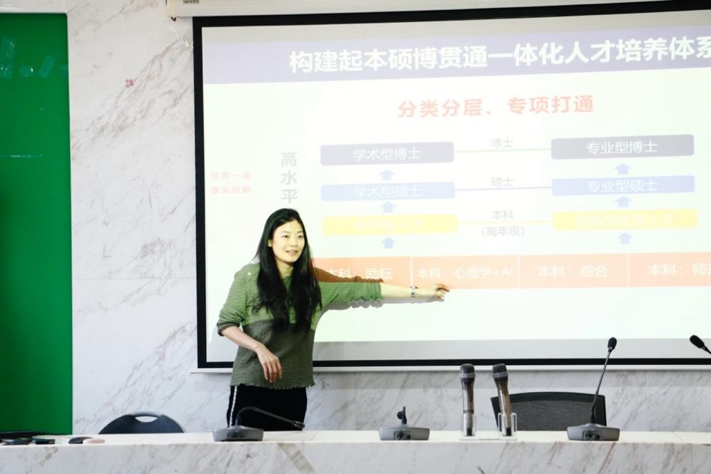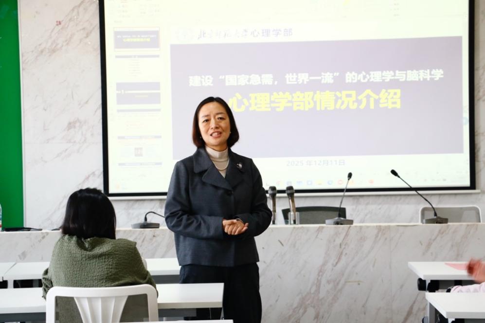 骆方副部长讲话 随后,周丽琴老师围绕北京师范大学心理学部的人才培养方案进行了系统解读,详细介绍了学部在本科与研究生阶段的培养目标、课程设置及发展特色,并结合心理学学科发展趋势,分享了北师大在拔尖创新人才培养方面的实践经验。同时,周老师也向天津师范大学的同学们发出诚挚邀请,欢迎优秀学子未来报考北京师范大学心理学部硕士及博士研究生,继续深造与发展。