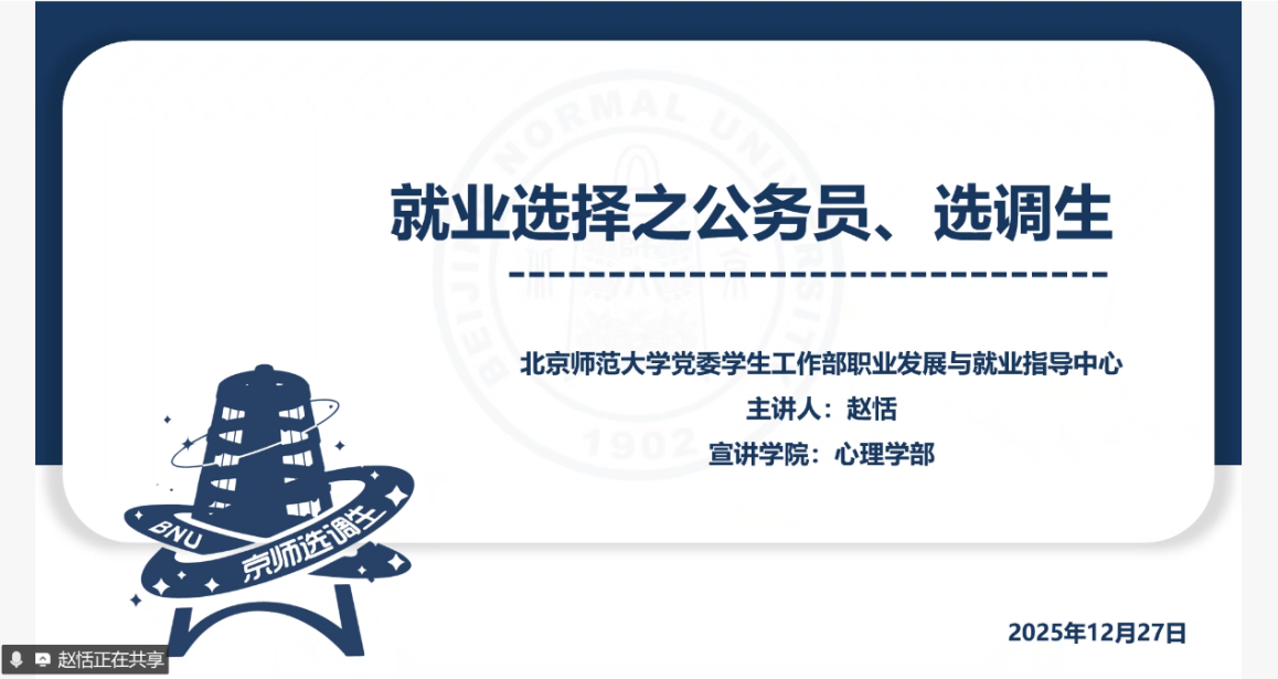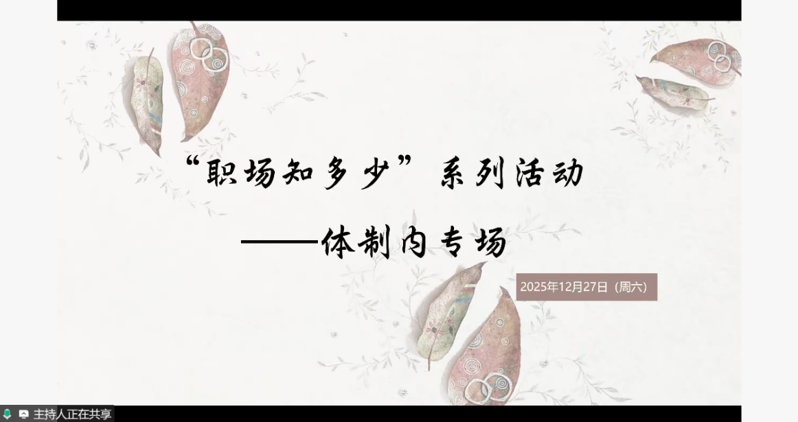 2025年12月27日下午,“职场知多少”系列活动——体制内专场分享会于线上腾讯会议顺利举办。活动由我校星辰宣讲团赵恬同学、心理学部往届毕业生李言师姐、张雨辰师姐共同主讲,吸引了近50名学子在线参与。分享会聚焦公务员、事业单位等体制内职业方向,通过政策解读、经验分享与互动答疑,助力学子把握招考要点、明晰职业路径,为未来就业选择提供务实指导。