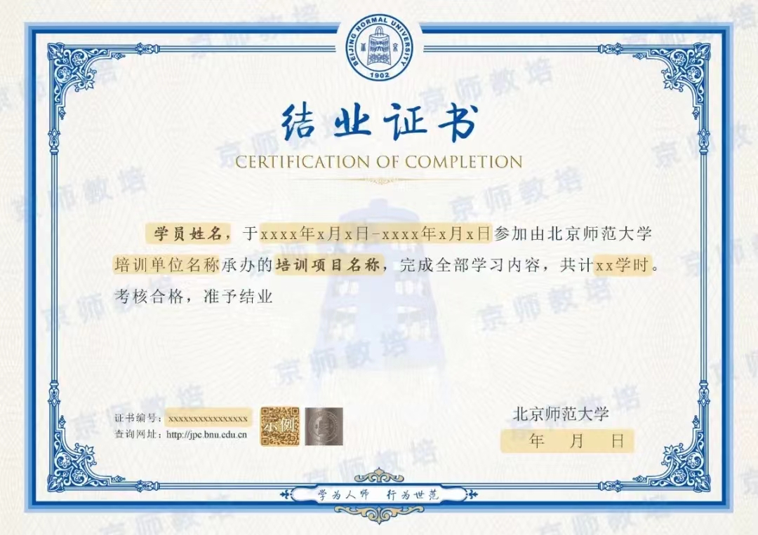 六、结业要求和结业证书 课程四个阶段共计240学时。修满学时、考核合格的学员,将获得“北京师范大学心理学部以人为中心取向心理咨询与治疗连续培训项目第七期珠海班”结业证书,可在学校培训管理信息平台(//jpc.tiaodanzhibo.com/cms/zscx/index.htm)进行证书查验。